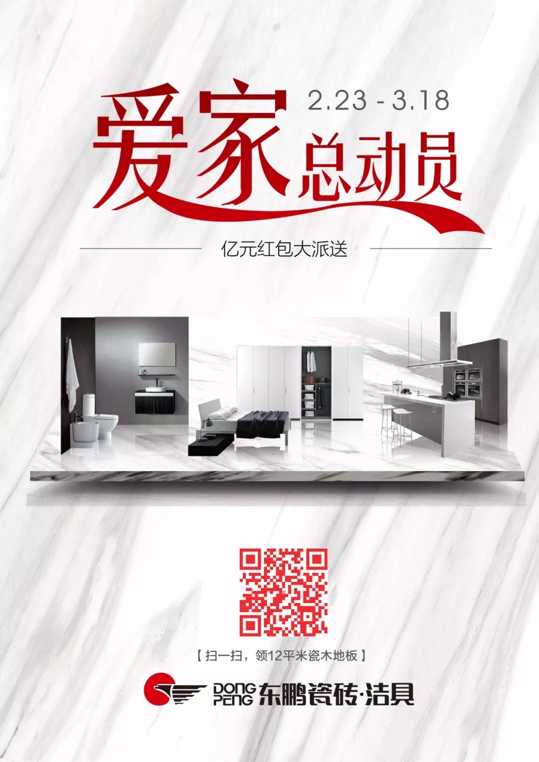 2月23日起至3月18日,登錄“天貓東鵬瓷磚官方旗艦店”,參與東鵬“愛(ài)家總動(dòng)員”活動(dòng),即可享受折扣優(yōu)惠,購(gòu)買1元特權(quán)訂金即可領(lǐng)取12平米瓷木地板,進(jìn)店更有通體大理石瓷磚白天鵝99元/片,消費(fèi)滿額即可獲得掃地機(jī)器人等豪華大禮。