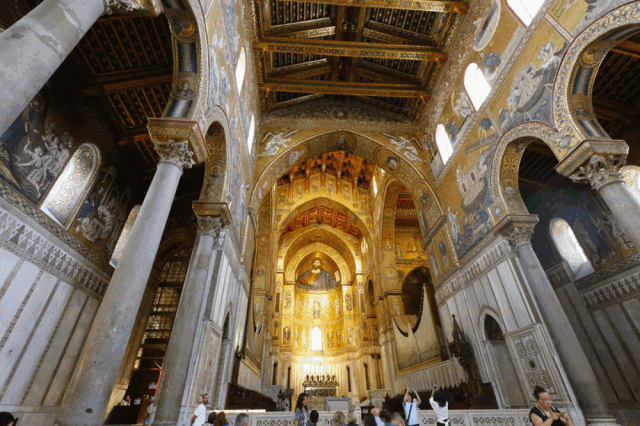 蒙雷阿萊修道院建于1200年,當(dāng)時(shí)的威廉姆二世,作為一個(gè)有包容心、欣賞北非與中東文化藝術(shù)的國(guó)王,他下重金請(qǐng)來(lái)最好的阿拉伯拜占庭、諾曼手工藝人修建此教堂。
