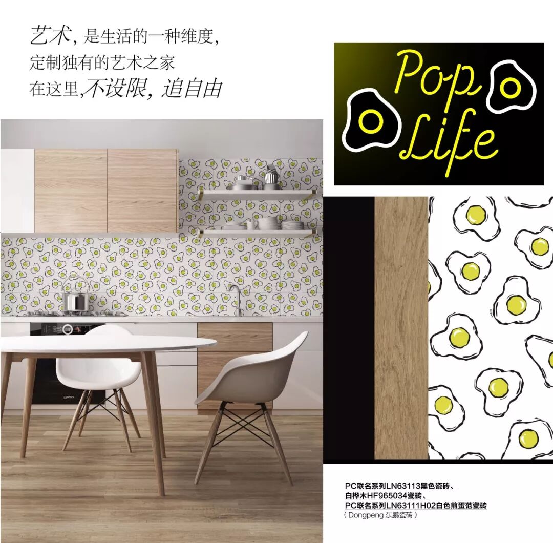 也在前不久,東鵬瓷磚聯(lián)合英國波普藝術家Philip Colbert,在上海發(fā)布首款藝術家聯(lián)名瓷磚“煎蛋范”與“爆米風”,以高飽和、高明度的有力色彩, 在穩(wěn)重的家居生活中打造活潑生動的俏皮生活。