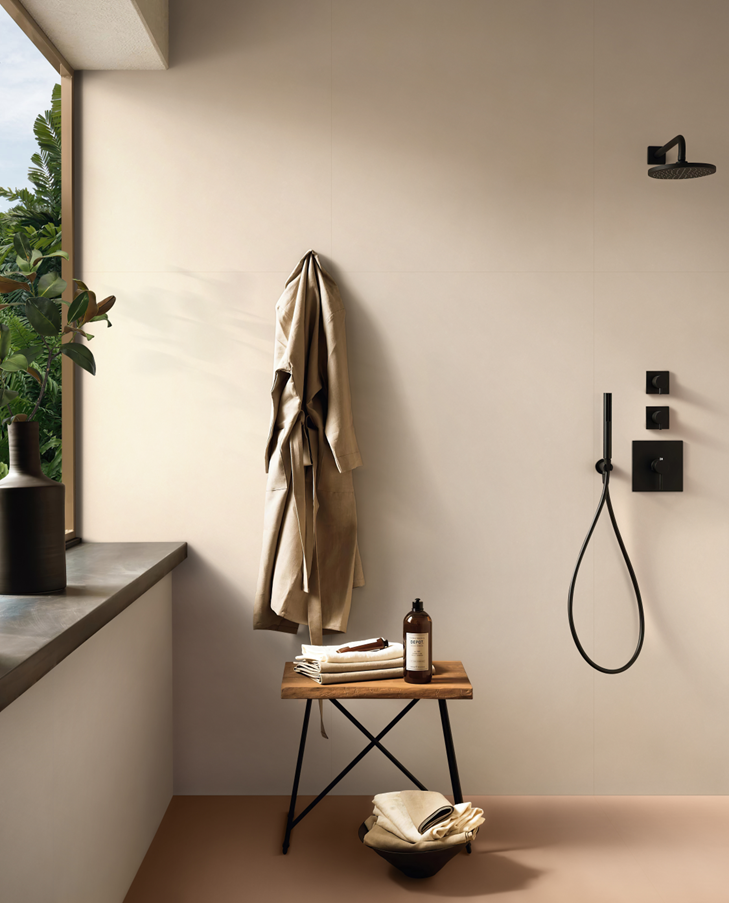 當與原木奶油風結合運用在浴室地面